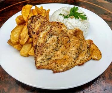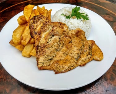 Grilled chicken fillet seasoned with salt, pepper, and oregano, served with house fries