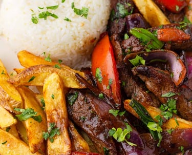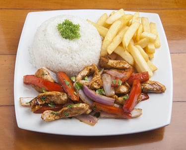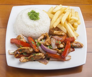 Traditional Peruvian stir-fry featuring tender chicken, onions, and tomatoes over fries.