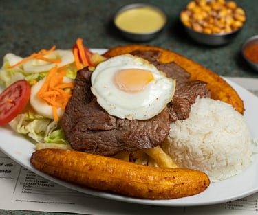 Juicy grilled steak served with fried eggs, plantains, fries, and a side of white rice.